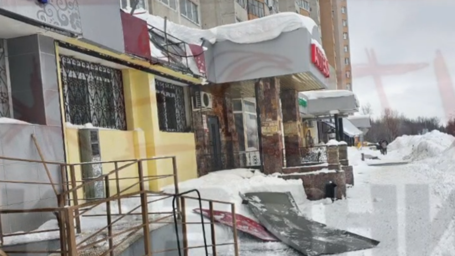 На проспекте Победы, 78, с крыши многоэтажного дома сорвалась снежная глыба и повредила вывеску магазина, пишут в соцсетях.