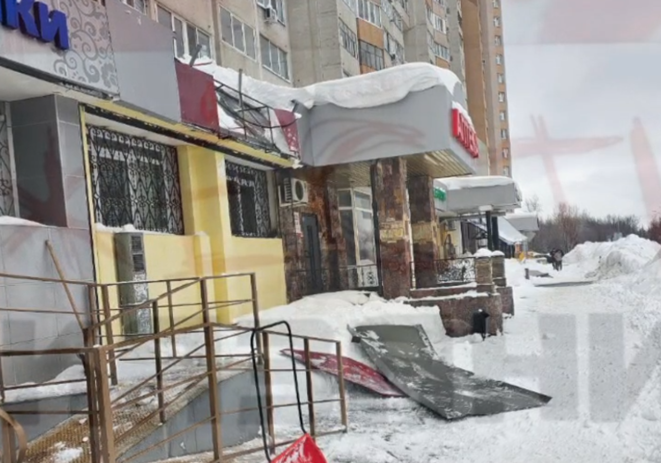 На проспекте Победы, 78, с крыши многоэтажного дома сорвалась снежная глыба и повредила вывеску магазина, пишут в соцсетях.