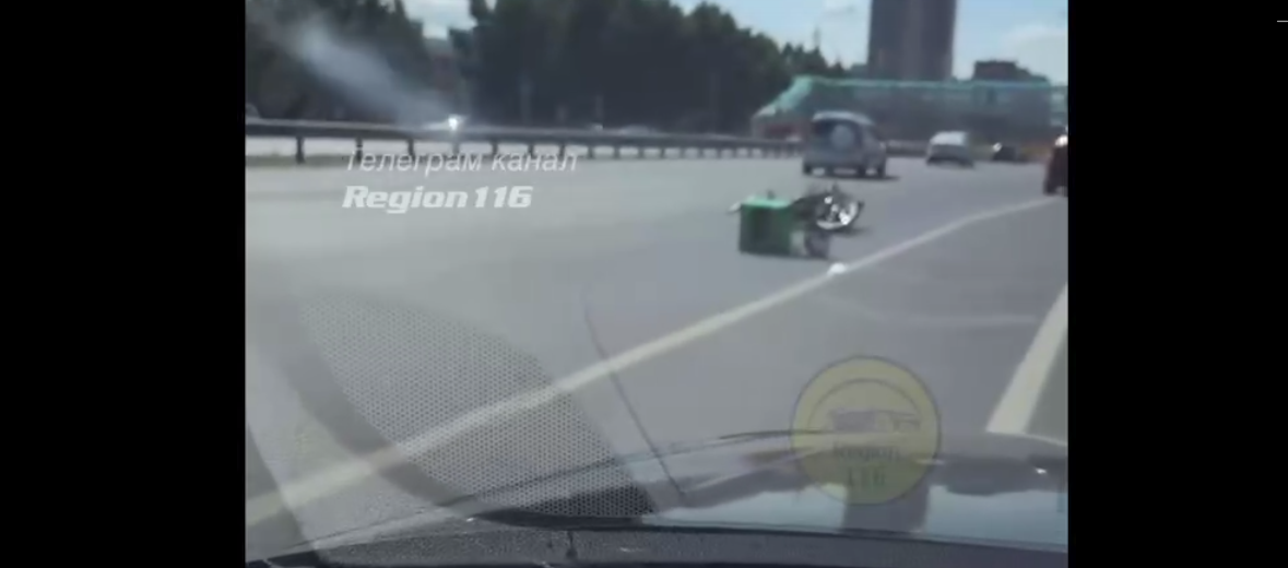 На кадрах видно мопед, лежащий посреди дороги, шлем и сумку, в которой, судя по всему, курьер доставлял заказ.