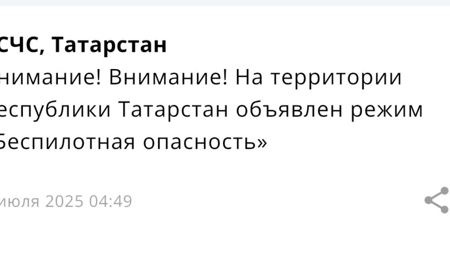 «Внимание! Внимание! Не территории Татарстана объявлен режим ”Беспилотная опасность”», — говорится в сообщении.