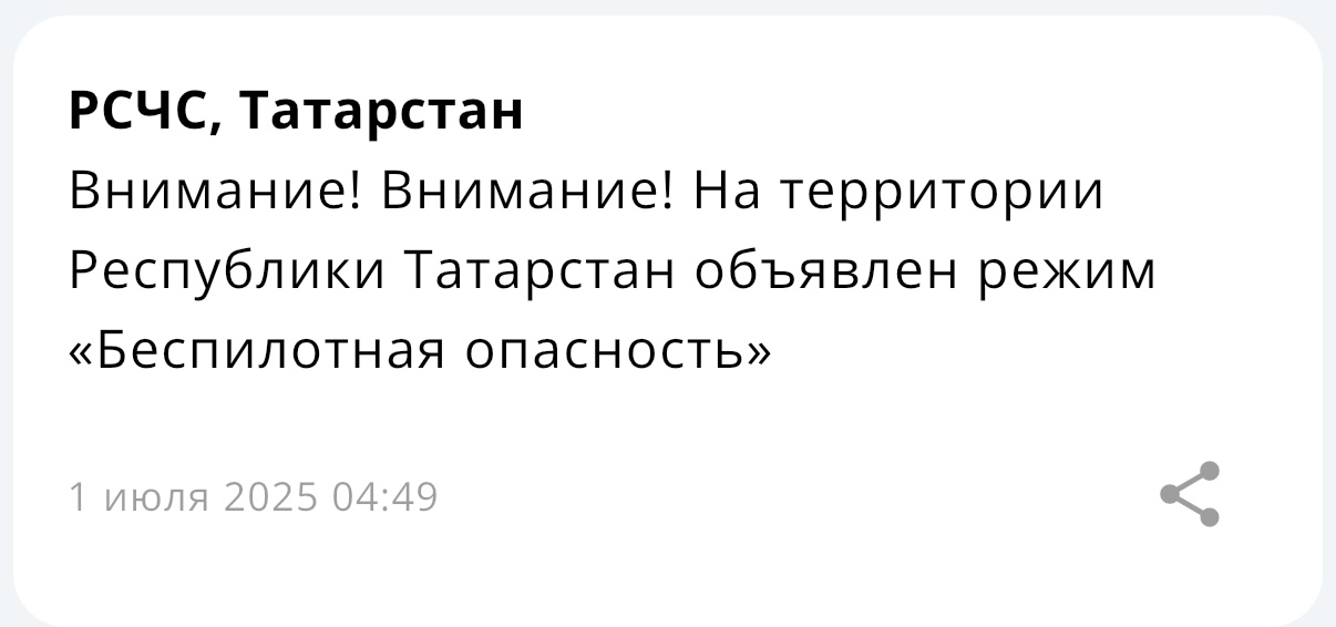 «Внимание! Внимание! Не территории Татарстана объявлен режим ”Беспилотная опасность”», — говорится в сообщении.