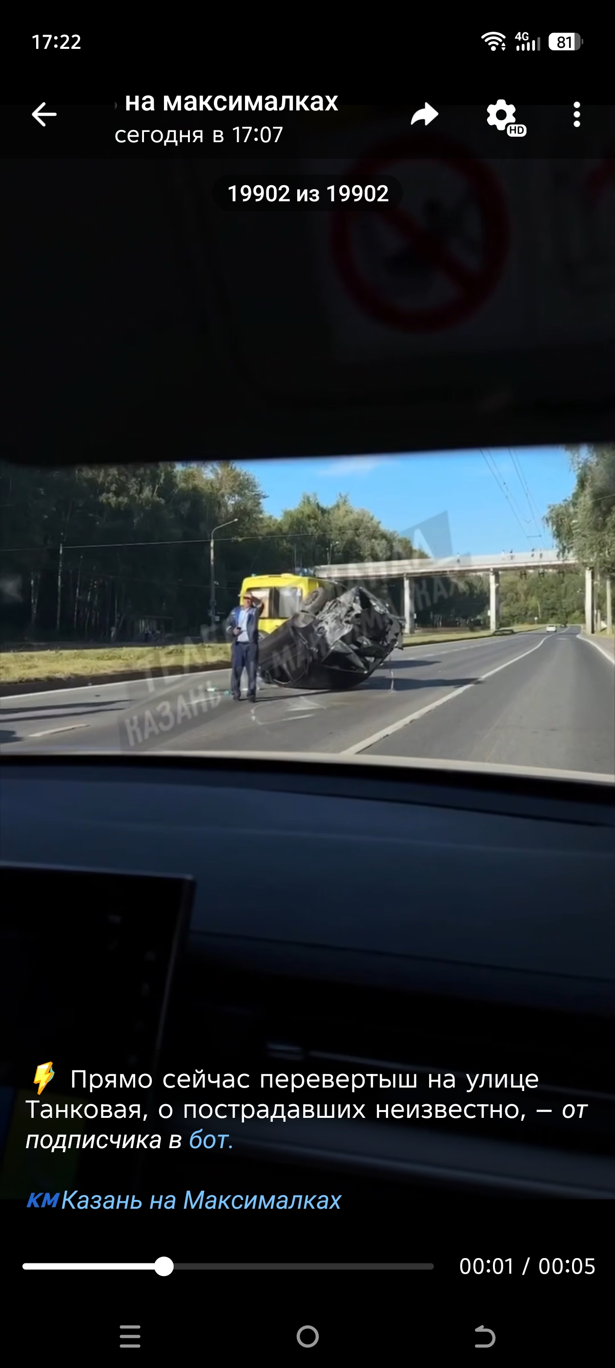 На видео видно, что машина лежит прямо на трассе на крыше, у нее сильно повреждена передняя часть, рядом работают автоинспекторы.