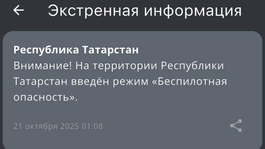 Пятую ночь подряд в Республике Татарстан вводится режим беспилотной опасности. Сообщение от МЧС России пришло в час ночи.