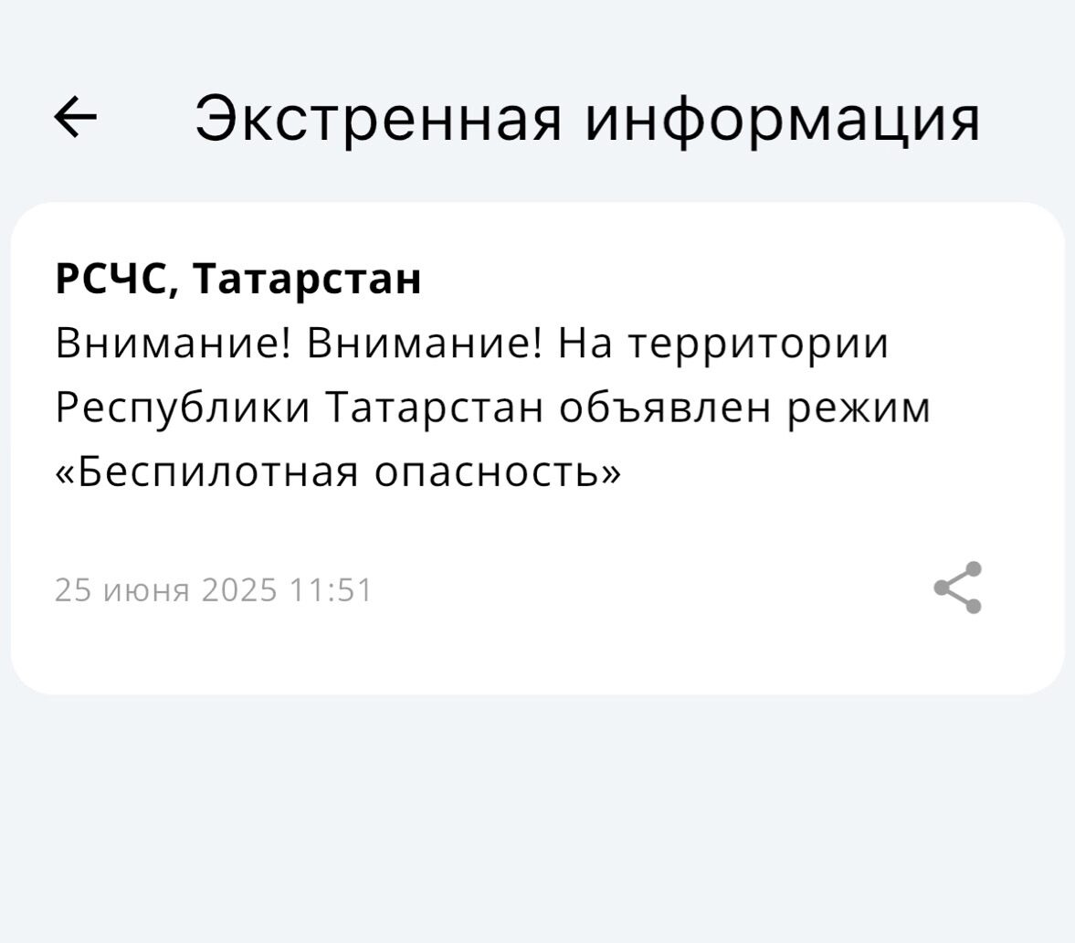 На территории Республики Татарстан введён режим «Беспилотная опасность». Об этом сказано в сообщении РСЧС.