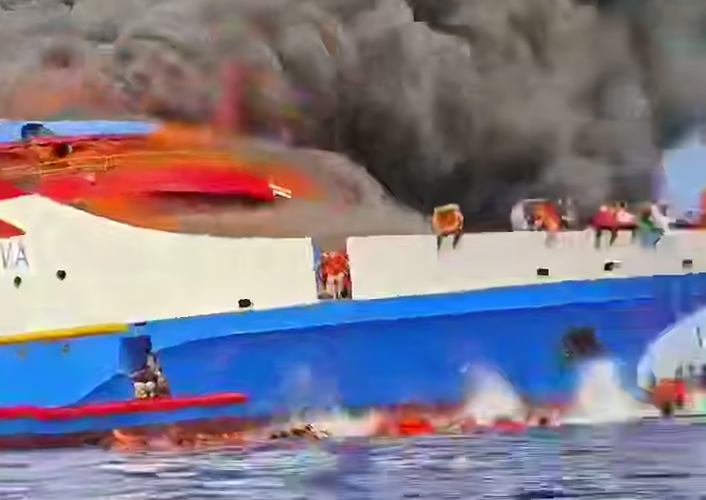 В социальных сетях появились драматичные видео с места происшествия. На кадрах видно, как охваченное пламенем судно дрейфует в море, а перепуганные люди прыгают за борт прямо в воду.