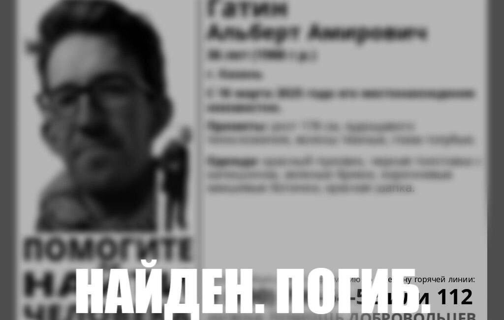 Пропавшего в Казани 36-летнего дизайнера Альберта Гатина нашли погибшим. Соответствующая ориентировка появилась в официальном сообществе поисковой группы «Лиза Алерт».