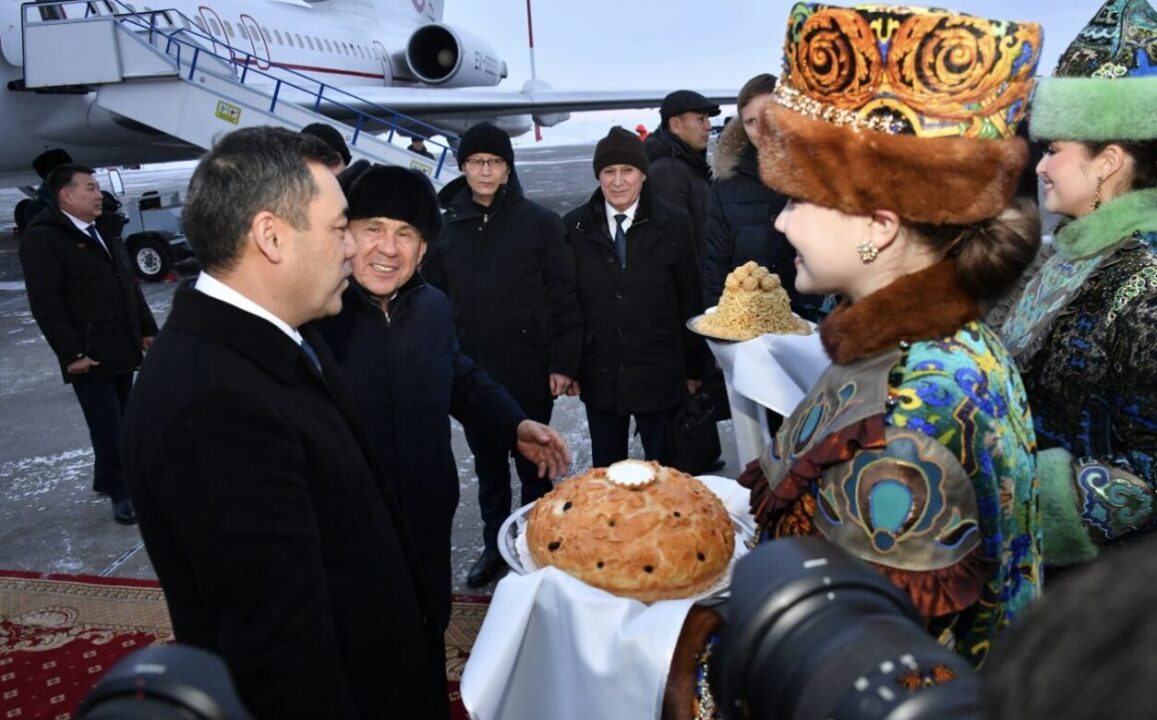 В международном аэропорту столицы Татарстана Президента Кыргызской Республики встретил Рустам Минниханов. Садыра Жапарова встретили с хлебом и солью и в национальных костюмах.