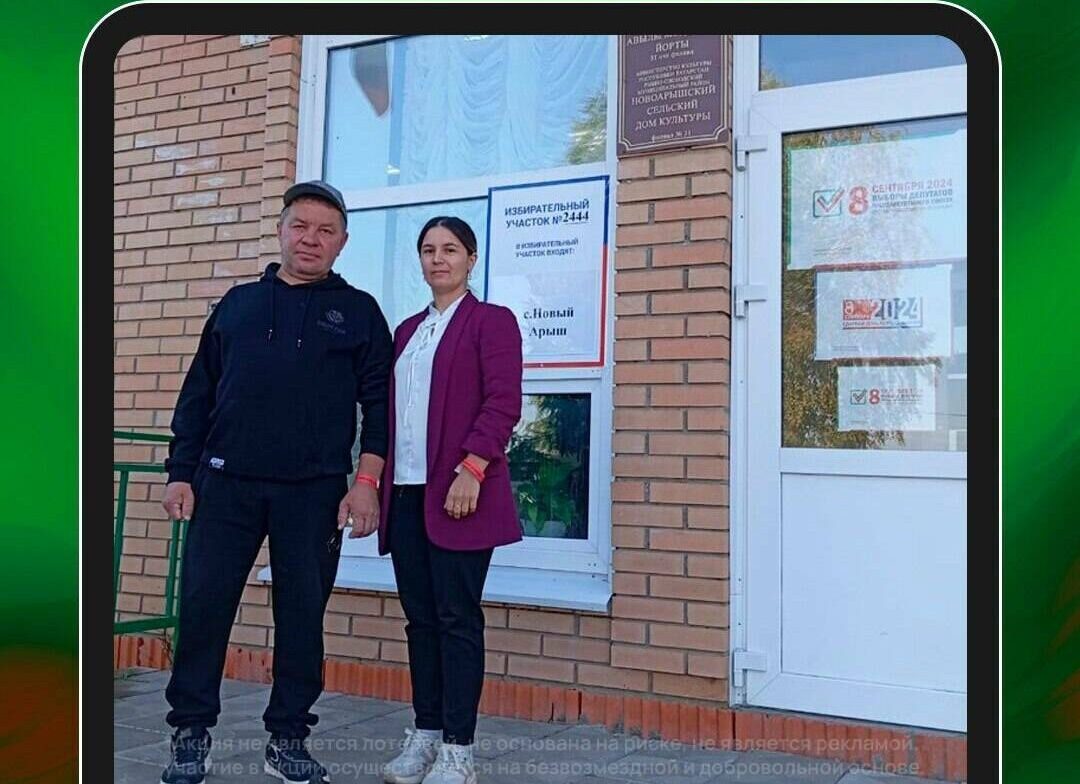 Первым победителем фотоконкурса «Всей семьёй на выборы!» стал Айрат Сафин. Он выиграл один из двенадцати iPhone 15. Победителя определили во время телемарафона на телеканале ТНВ. Как сообщили организаторы конкурса, с 7 до 8 утра в конкурсе приняли участие 811 человек.