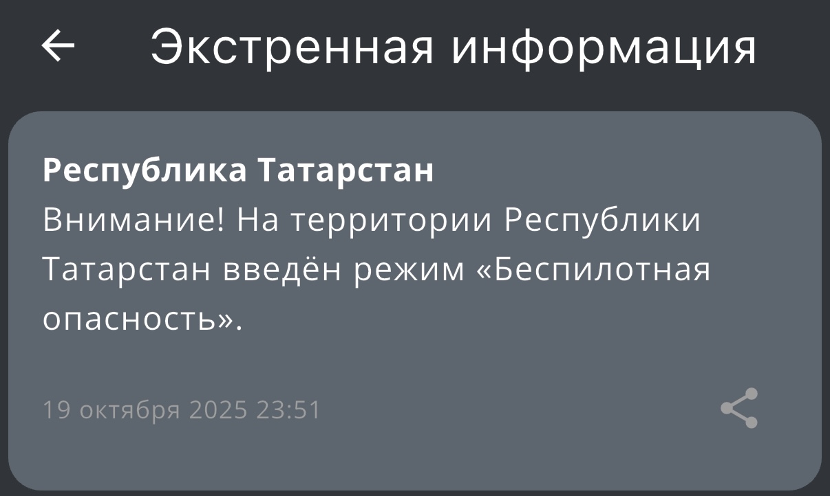 В очередной раз в Татарстане был введен режим беспилотной опасности. Сообщение от МЧС России поступило накануне около полуночи.
