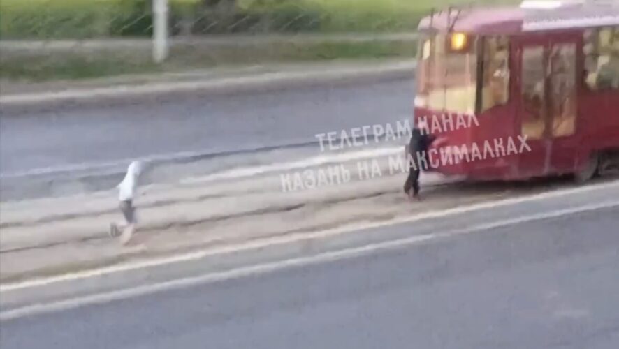 В соцсетях и телеграм-каналах появилось видео с опасными развлечениями казанских подростков. На кадрах видно, как на улице Копылова в Казани трое ребят бегут по рельсам за движущимся трамваем, а после один цепляется за заднюю часть транспорта.
