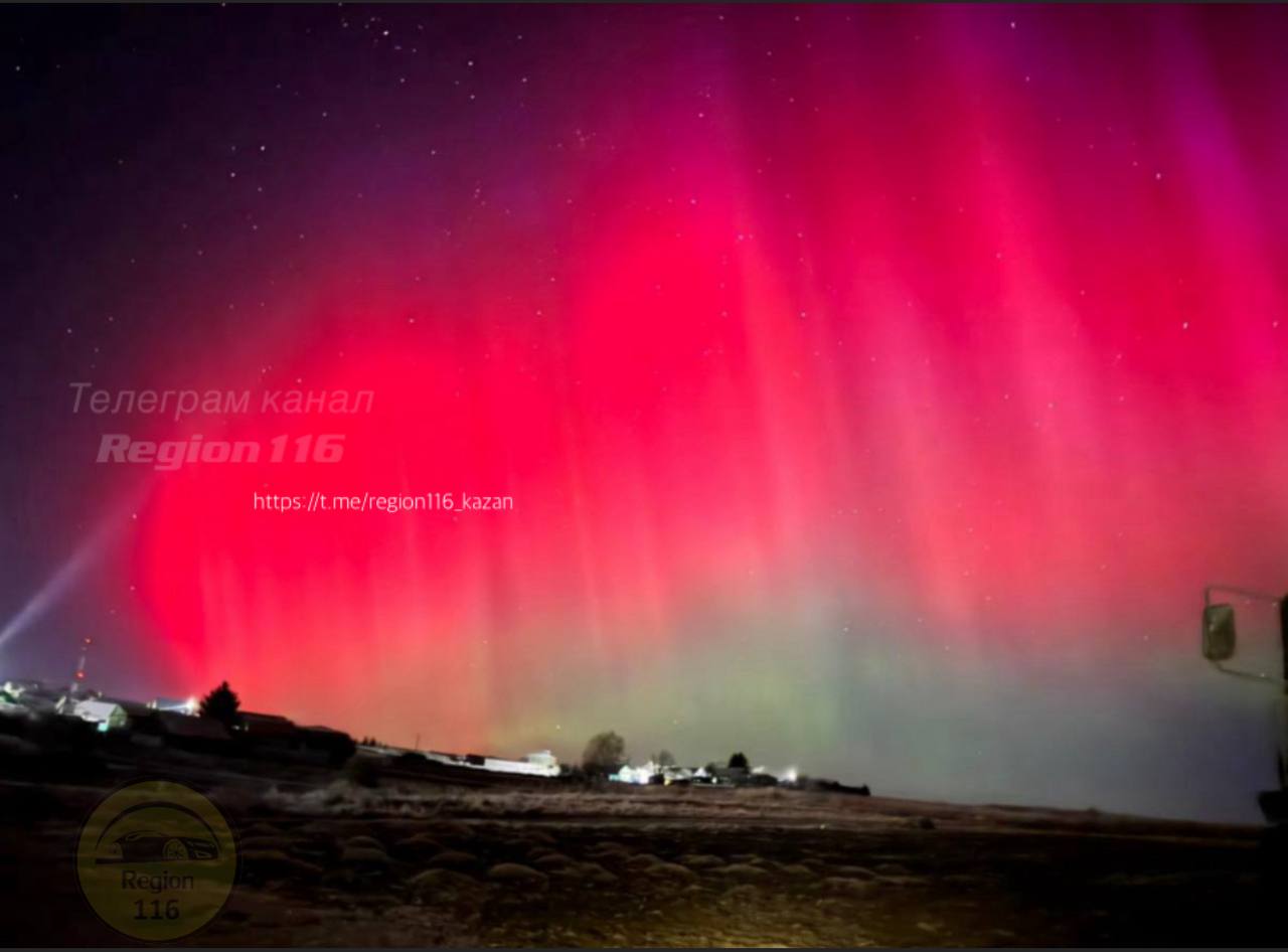 Очевидцы делятся фотографиями в социальных сетях, где видно, как разноцветное свечение нависло над населённым пунктом. Явление внешне напоминает полярное сияние.