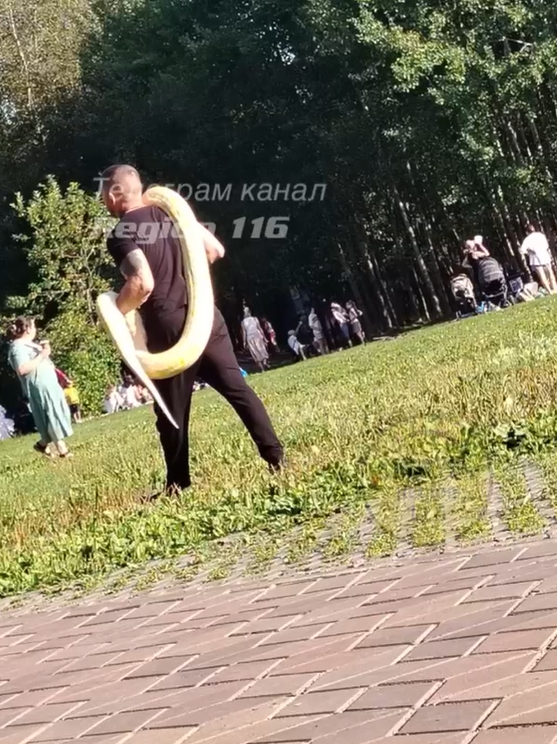 В парке был замечен мужчина, спокойно прогуливающийся с большим питоном. Он держал его на руках.