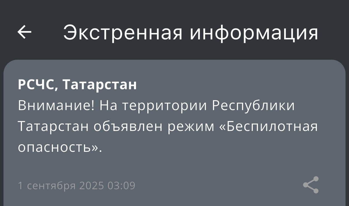 Сегодня около трех утра в Татарстане вновь был объявлен режим беспилотной опасности. Сообщение пришло от МЧС России.