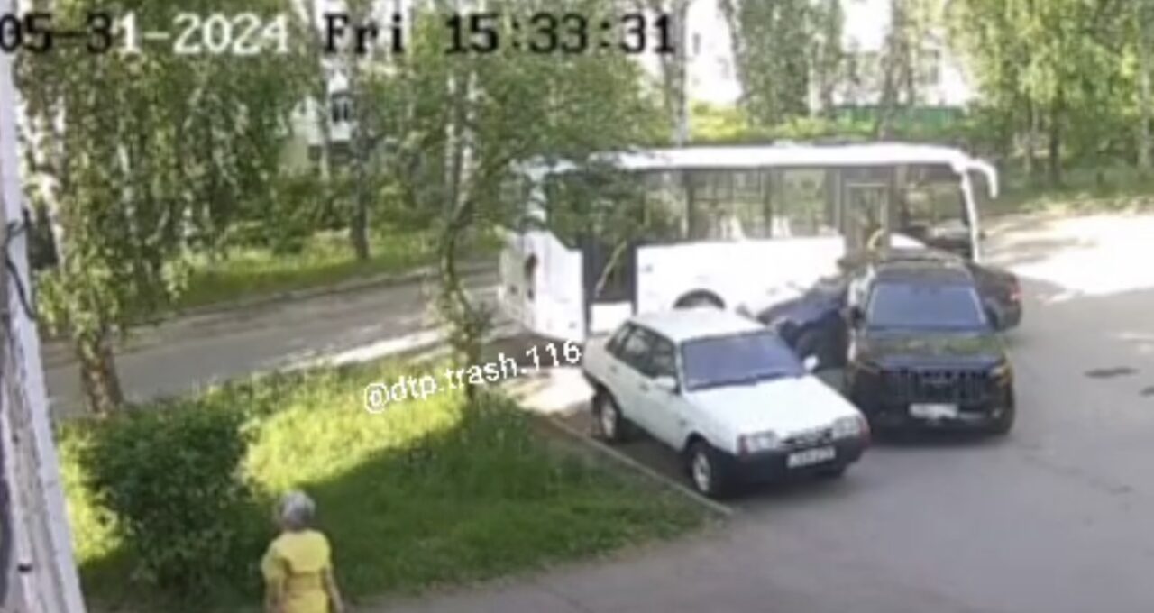 Автобус, судя по кадрам, въехал прямо в припаркованную легковушку и снес её, задев две другие. Неизвестно, находился ли кто-то за рулем автобуса в момент наезда.