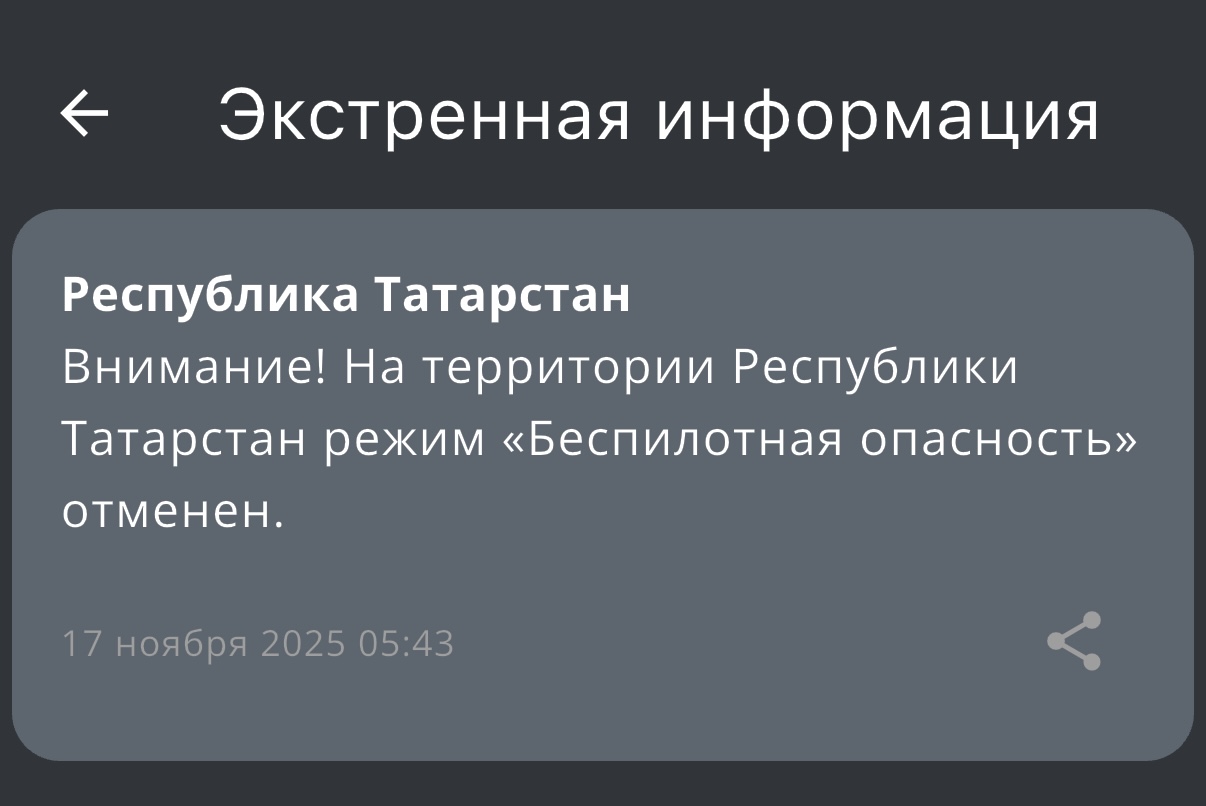 В 5:43 режим беспилотной опасности отменили. Ограничения в двух основных воздушных гаванях РТ не вводились.
