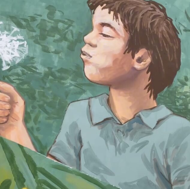 Летний рисунок он нанес впервые в 2023 году, но со временем картина потеряла свою яркость и красочность. Теперь же девочка с книжкой и мальчик с одуванчиком снова появились на стенах столицы Татарстана.