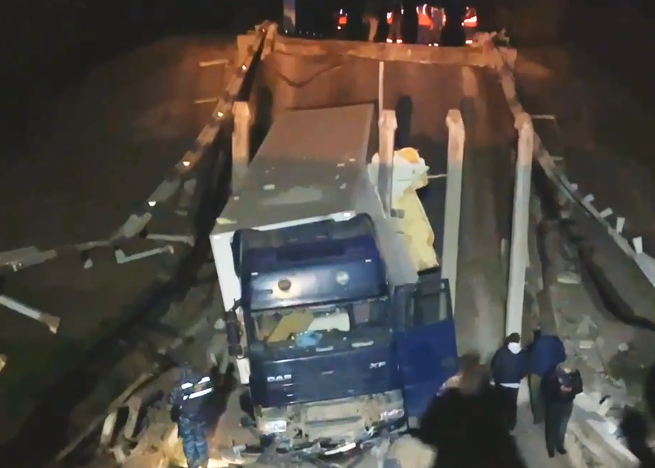 По сообщению МЧС, двое человек получили травмы, а дорожное полотно было повреждено. На мосту были легковой автомобиль и грузовик.