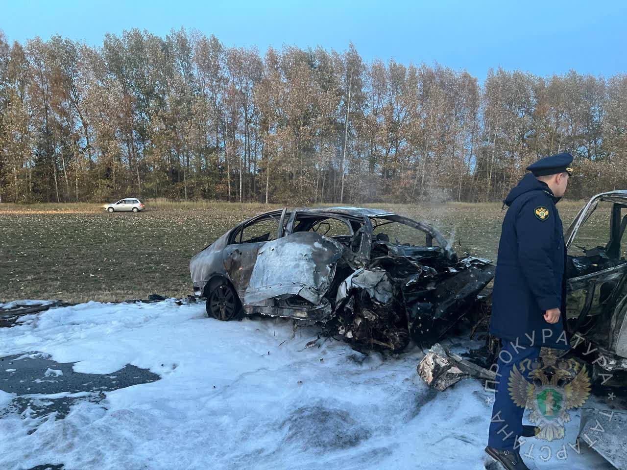 Сегодня на трассе Казань-Оренбург произошло страшное ДТП с участием двух иномарок, которые столкнулись лоб в лоб и загорелись. Фото с места происшествия публикует прокуратура Татарстана.