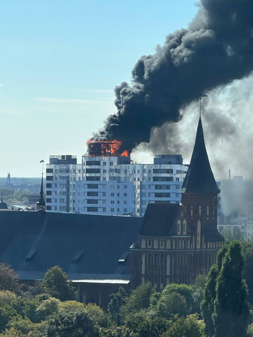 Жители Калининграда засняли объятую пламенем многоэтажку в районе Рыбной деревни. Об этом сообщает издание «RT на русском» со ссылкой на МЧС региона.