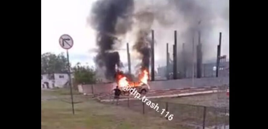На кадрах видно объятую огнём легковушку, стоящую неподалёку от бензоколонки. На месте происшествия работал экипаж пожарных.