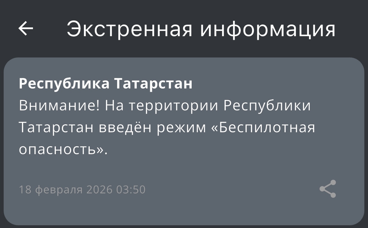 Режим беспилотной опасности вновь объявлен в Татарстане. Сообщение от МЧС России поступило в 03:50.