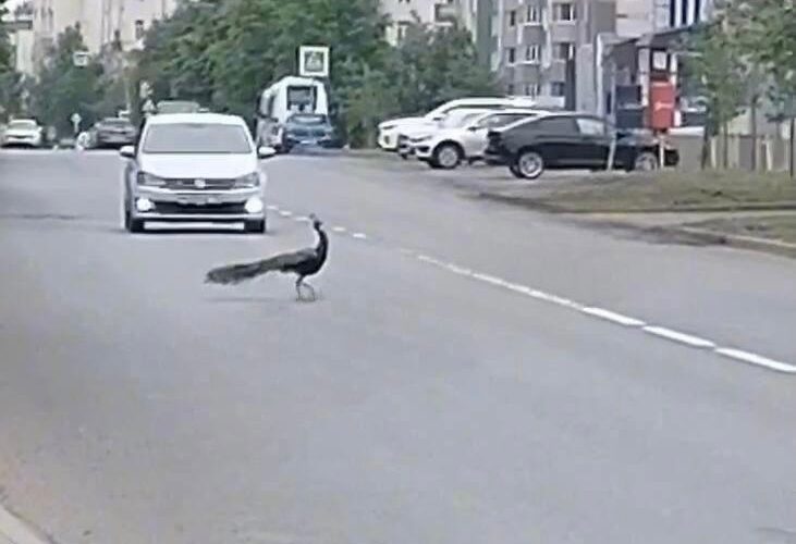 На кадрах видно, как заморская птица передвигается по проезжей части, едва не попадая под колеса машин. В соцсетях предполагают, что павлин сбежал из зооботсада.