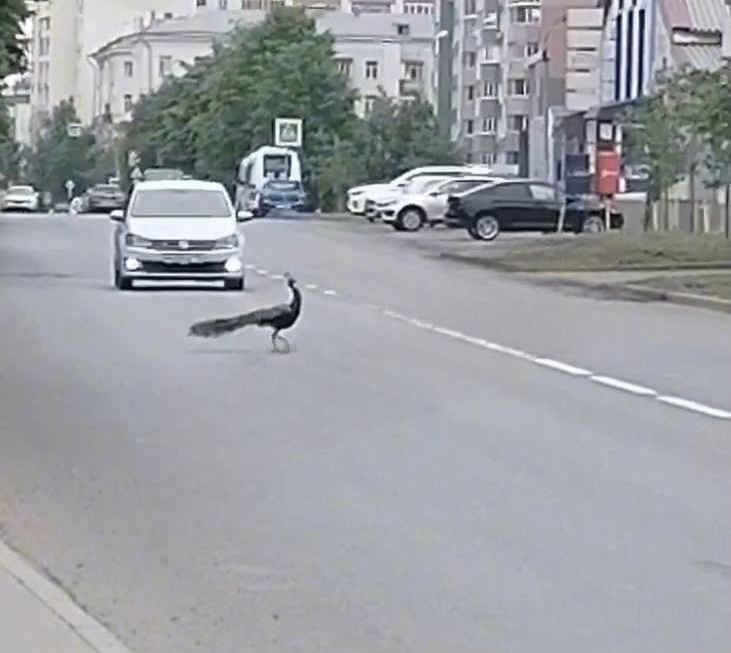 На кадрах видно, как заморская птица передвигается по проезжей части, едва не попадая под колеса машин. В соцсетях предполагают, что павлин сбежал из зооботсада.