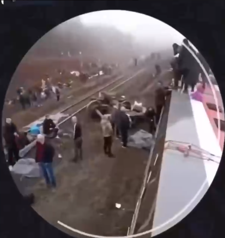 В социальных сетях появилось видео с места происшествия. На кадрах видно перевернутые вагоны поезда, рядом с ними лежат люди.