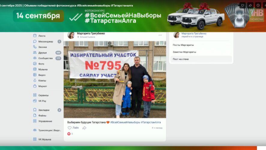Всего в рамках акции разыграют 11 смартфонов iPhone 16, два автомобиля Sollers ST8 и около 10 бытовых призов, включая аэрогрили и роботы-пылесосы. Для того, чтобы принять участие, с 07:00 до 20:00 сделайте семейное фото у избирательного участка с браслетом «Всей семьей на выборы» (получите его после голосования), где виден узнаваемый элемент входа – надпись или баннер. Опубликуйте в «ВКонтакте» с хэштегами #ВсейСемьейНаВыборы и #ТатарстанАлга. Полные правила – в сообществе «Татарстан Алга» в разделе «Правила фотоконкурса 14 сентября 2025». Конкурс завершится в 21:30.