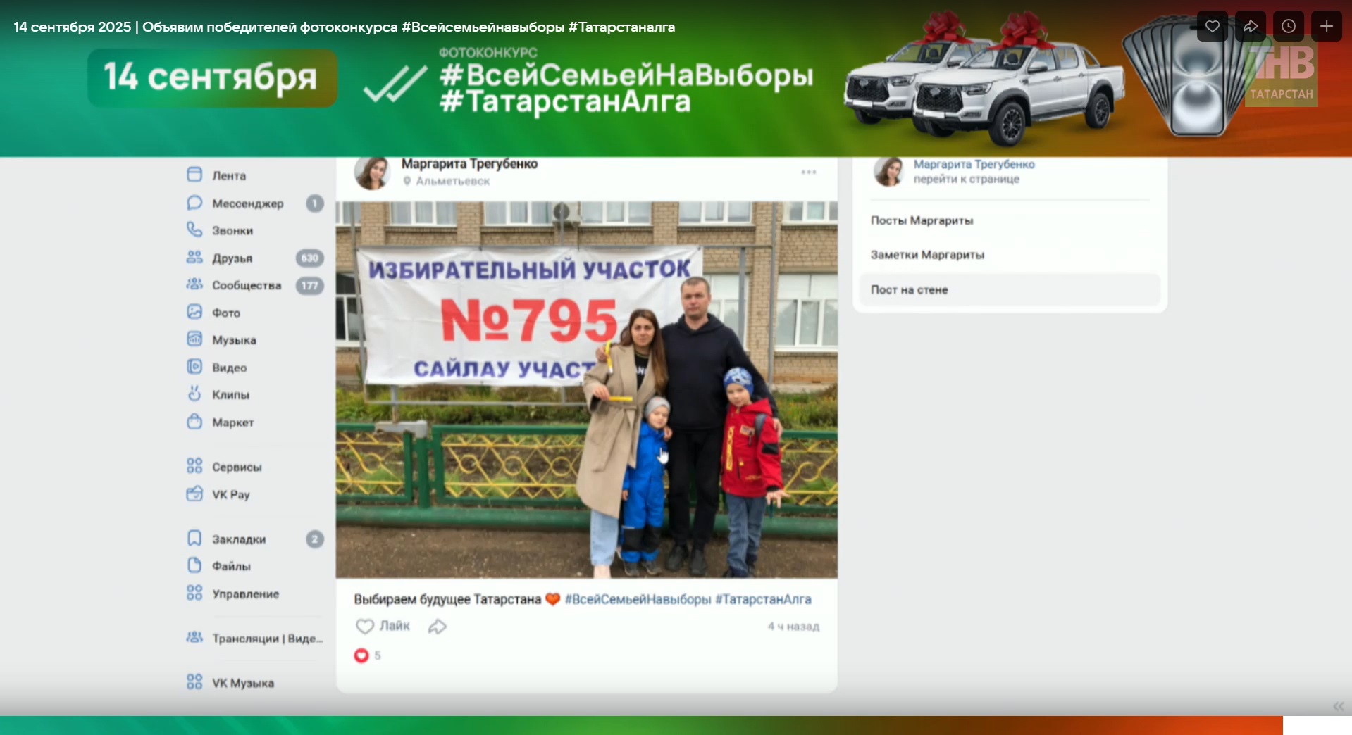 Всего в рамках акции разыграют 11 смартфонов iPhone 16, два автомобиля Sollers ST8 и около 10 бытовых призов, включая аэрогрили и роботы-пылесосы. Для того, чтобы принять участие, с 07:00 до 20:00 сделайте семейное фото у избирательного участка с браслетом «Всей семьей на выборы» (получите его после голосования), где виден узнаваемый элемент входа – надпись или баннер. Опубликуйте в «ВКонтакте» с хэштегами #ВсейСемьейНаВыборы и #ТатарстанАлга. Полные правила – в сообществе «Татарстан Алга» в разделе «Правила фотоконкурса 14 сентября 2025». Конкурс завершится в 21:30.