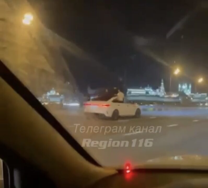 На кадрах видео, как по Кремлевской дамбе нар отличной скорости едет белая легковушка. Из окон иномарки вылезли трое парней. Ребята держаться за авто и, судя по всему, совершенно не бояться упасть.