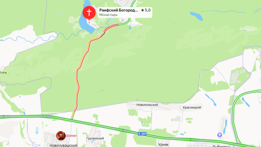 Огромная пробка в сторону Раифского Богородицкого мужского монастыря собралась в четверг, 8 января, в Казани. Об этом свидетельствует информация из сервиса «Яндекс Карты».