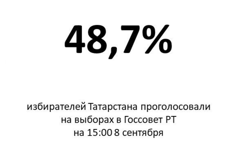 К 15:00 явка на выборы в Государственный Совет Республики Татарстан составила 48,7%. Об этом сообщает система ГАС «Выборы».