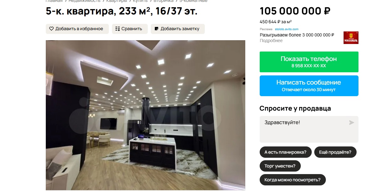 Речь идет о пятикомнатной квартире общей площадью 233 квадрата, расположенной на 16 этаже. Стоимоть недвижимости в высотке оценивается в 105 миллионов рублей. Само объявление опубликовано на следующий день после атаки БПЛА.