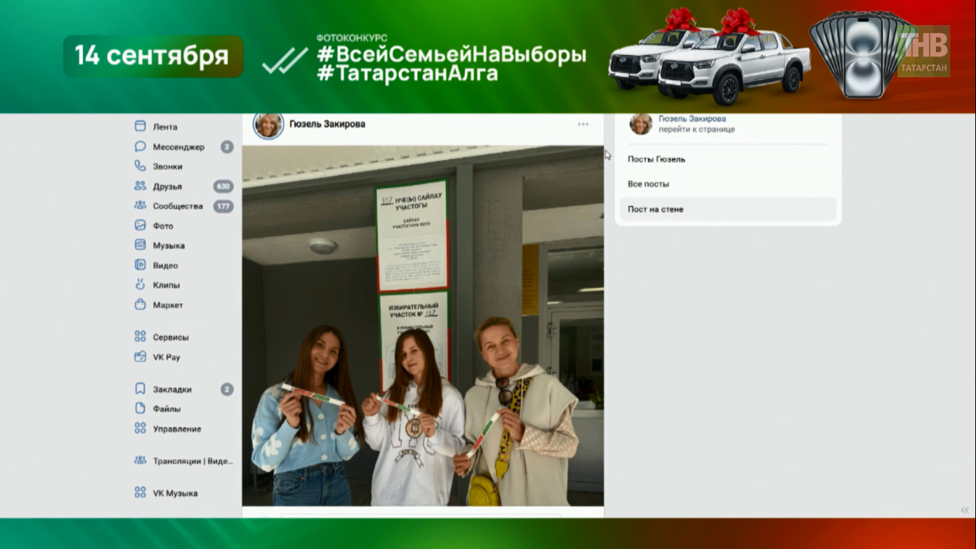 В конкурсе предусмотрено 11 iPhone 16, два внедорожника Sollers ST8 (производимые в Елабуге) и 10 бытовых гаджетов вроде аэрогрилей. Чтобы присоединиться: сфотографируйтесь семьёй на фоне участка с браслетом после голосования (с 7 до 20 часов), убедитесь в видимости входного элемента (плакат, баннер). Выложите в VK с #ВсейСемьейНаВыборы и #ТатарстанАлга. Детали правил – в группе «Татарстан Алга». Финал в 21:30.