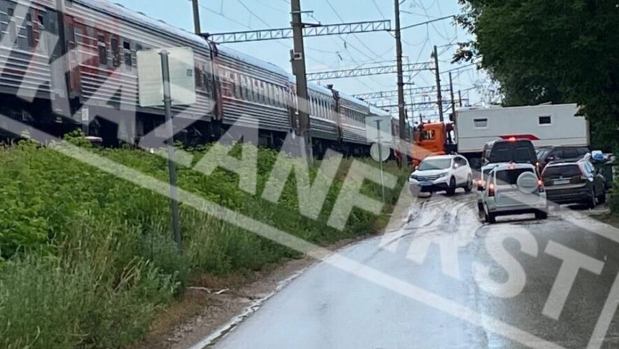 Судя по видео, ранее вставший поезд уже тронулся, однако машины по-прежнему стоят на месте.