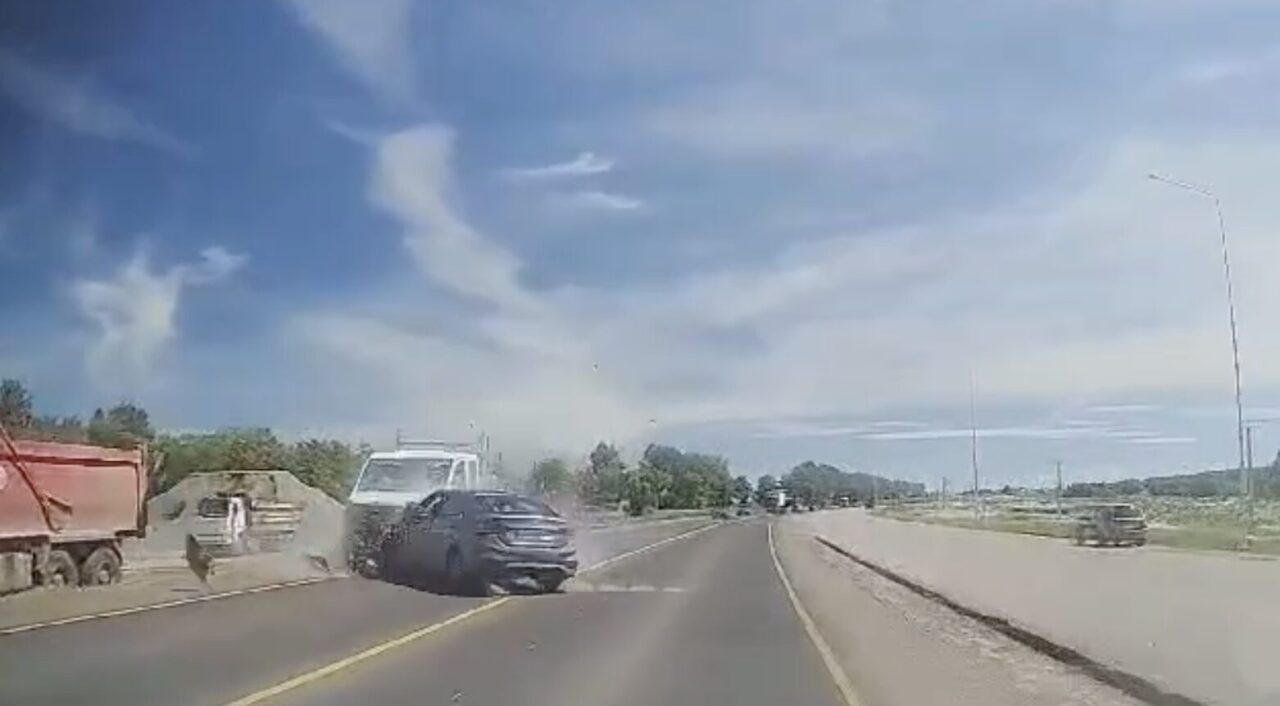 На кадрах видно, как легковой автомобиль резко выезжает на встречную полосу во время движения по трассе. В этот момент на дороге появляется «Газель», с которой авто и столкнулось. Легковушка врезалась в большегруз лоб в лоб, из-за чего весь передний бампер авто смялся.