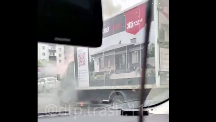 Судя по кадрам, грузовая машина стоит на месте, от неё идёт дым и огонь. По предварительным данным, пострадавших нет.
