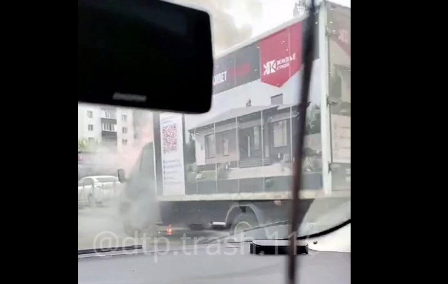 Судя по кадрам, грузовая машина стоит на месте, от неё идёт дым и огонь. По предварительным данным, пострадавших нет.