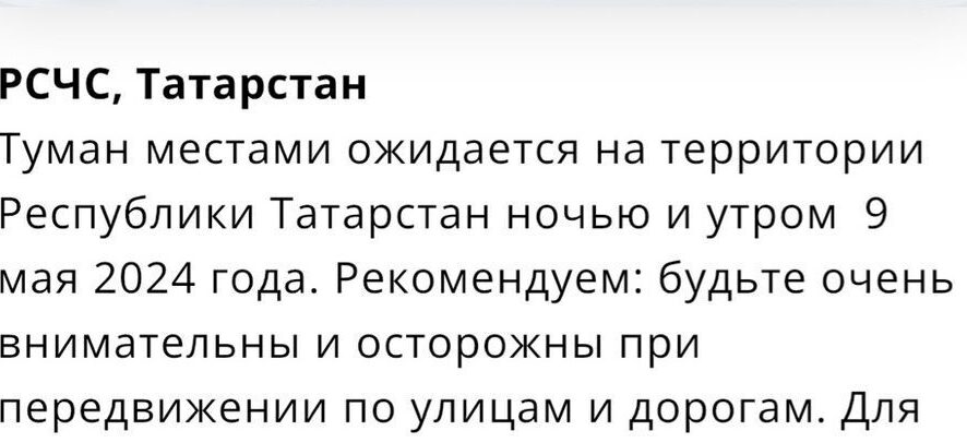 — Туман местами ожидается на территории Республики Татарстан ночью и утром 9 мая 2024 года, — сказано в сообщении, опубликованном сегодня, 8 мая 2025-го.