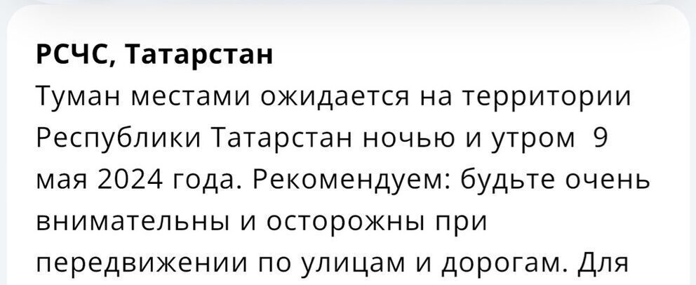 — Туман местами ожидается на территории Республики Татарстан ночью и утром 9 мая 2024 года, — сказано в сообщении, опубликованном сегодня, 8 мая 2025-го.