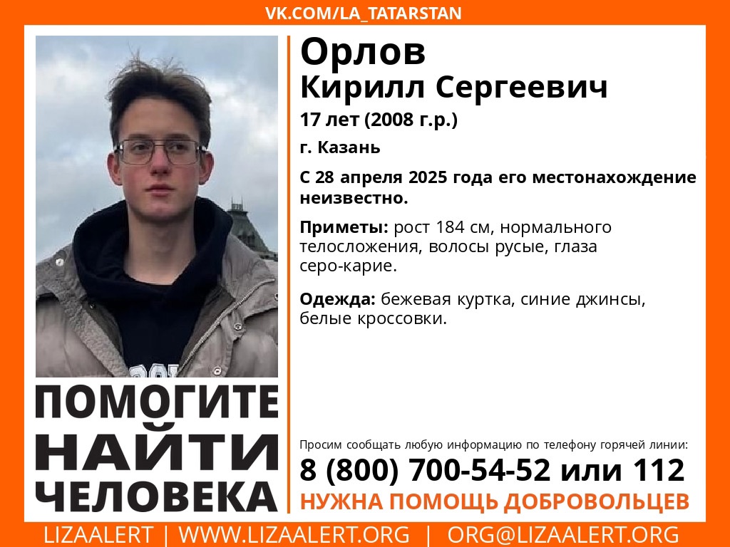 Местонахождение Кирилла Орлова неизвестно с 28 апреля. Место пропажи: город Казань. Приметы: рост 184 см, нормального телосложения, волосы русые, глаза серо-карие. Одежда: бежевая куртка, синие джинсы, белые кроссовки.