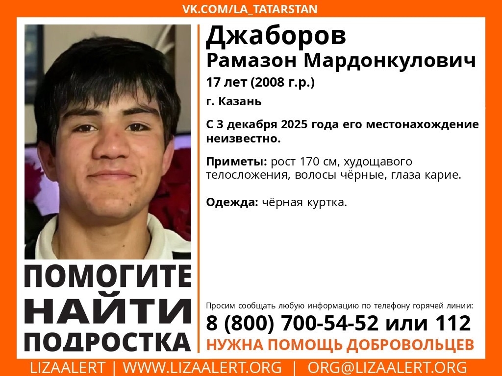 Речь идёт о 17-летнем Рамозоне Джаборове, который пропал в Казани. Его местоположение неизвестно с третьего декабря этого года. Его рост около 170 см, он худощавого телосложения, волосы чёрные, глаза карие. Одет был в чёрную куртку.