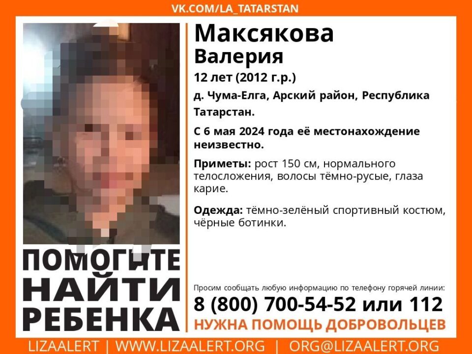 Известно, что девочка пропала 6 мая в деревне Чума-Елга Арского района. Рост ребенка около 150 см, нормального телосложения, волосы тёмно-русые, глаза карие.