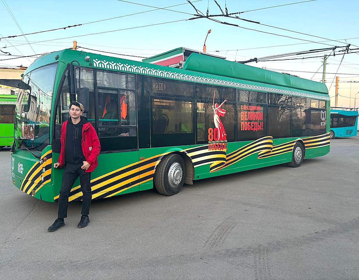 С 21 апреля на дорогах столицы Татарстана появился новый парадный троллейбус, который передвигается по маршруту №6. Его за собственные деньги украсил ко Дню Победы студент КГЭУ Никита Тищенко. Юноша приехал в Казань из Краснодона, Луганской Народной Республики и сейчас совмещает учебу в университете с работой в МУП «Метроэлектротранс».