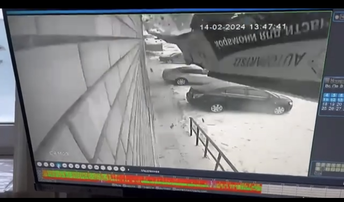 На кадрах видно, как в припаркованную у торгового центра в иномарку садится женщина. Спустя мгновение на машину падает огромный кусок кровли. Она проминает крышу и лобовое стекло авто.