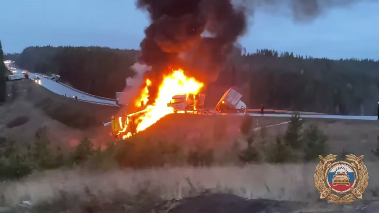 По данным ведомства, в инциденте участвовали семь грузовых машин и одна легковая. Пять автомобилей, включая автовоз с семью новыми легковушками, полностью сгорели. Водитель автовоза погиб, еще три человека пострадали, из них двое госпитализированы.
