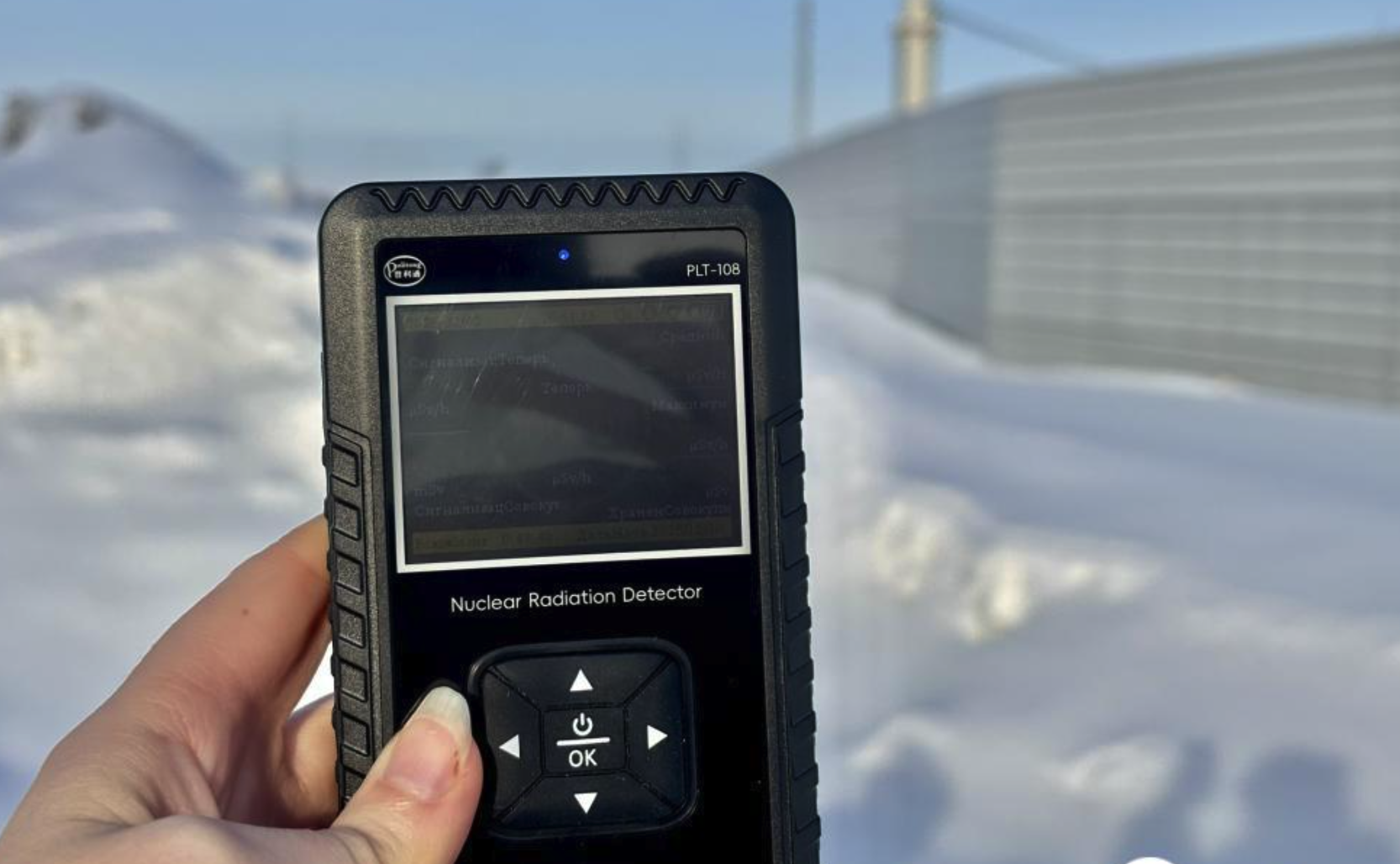 И напоследок — вишенка. В соцсетях периодически гуляют страшилки: «Снег в Новосибирске радиоактивный» Мы вышли на улицу, подошли с прибором к сугробу на обочине и поднесли счётчик прямо к снегу. 0.16 мкЗв/ч — ровно столько же, сколько показывает средний фон по городу. Никаких аномалий.