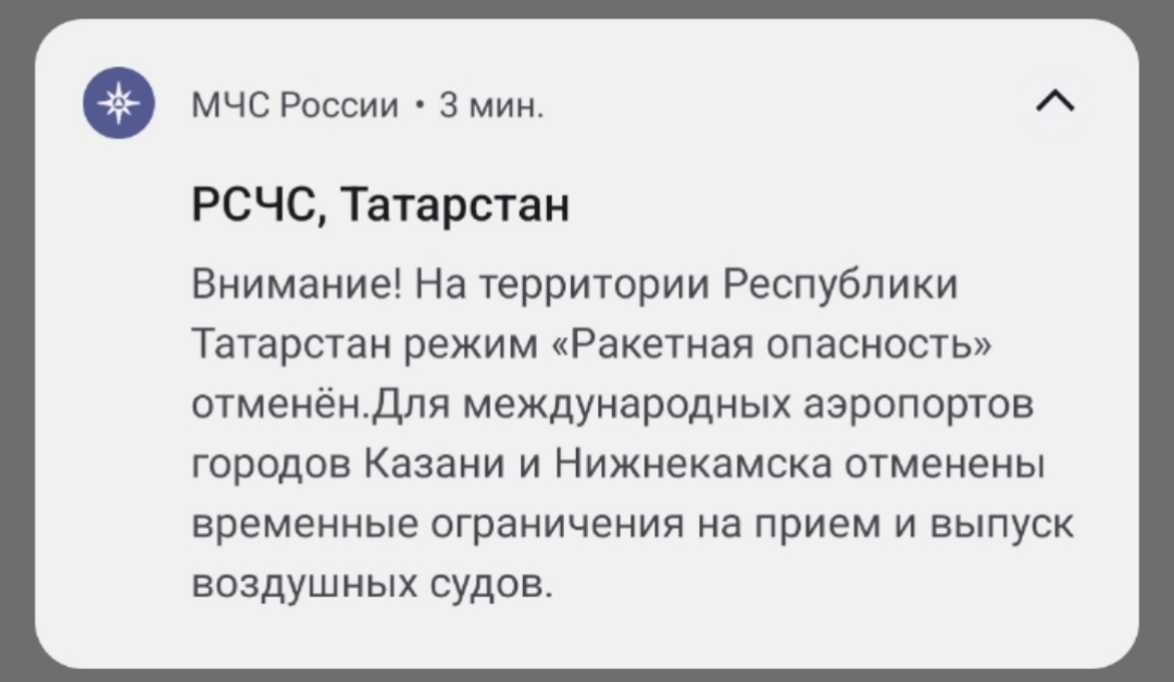 Режим «Ракетная опасность» в Республике Татарстан отменен. Об этом сообщает ГУ МЧС РФ по РТ.