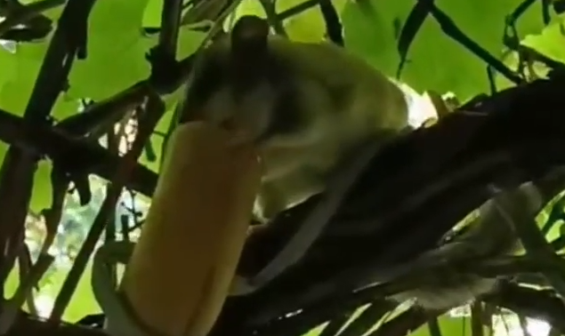 На кадрах видно, как соня лакомится бананом, который хозяева дачи привязали к дереву. Животное ведет себя настороженно, но от угощения не отказывается.